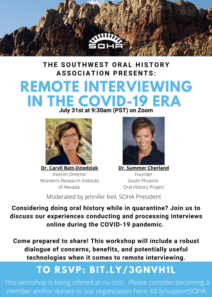 Remote Interviewing in the COVID-19 Era July 6, 2020 smcchistory Uncategorized Leave a comment Free Round-table presented by the Southwest Oral History Association Share this: Click to share on X (Opens in new window) X Click to share on Facebook (Opens in new window) Facebook Like Loading... Related