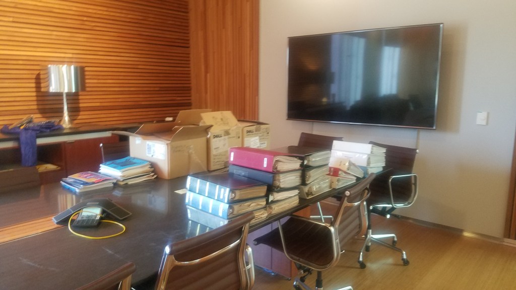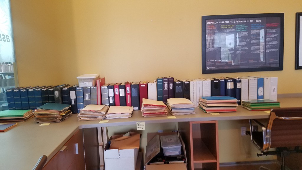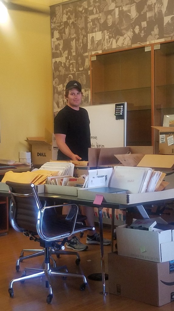 We began with about fifty boxes of uncategorized newspaper articles, photographs, documents, and other records in a dusty awkward meeting space loosely titled “The History Room.” A deteriorating empty trophy case took up most of the space, along with unusable secretarial desks built into the wall and a giant conference table. We started by cataloguing, indexing, and sorting all of the material.