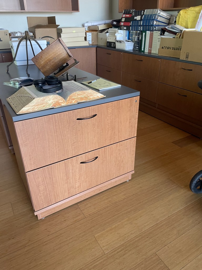 Then, we proposed new furniture more akin to storage, preservation, and access. We decided on standing-level counters, so that students and researchers could move about the space freely. We also chose many filing drawers, some cabinets, and several viewable shelves to inspire interest from the public.
