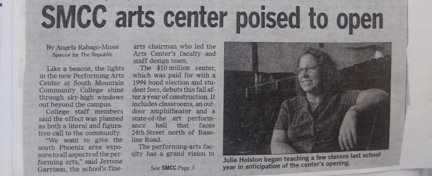 With thirteen years of teaching high school under her belt, Julie sought some new opportunities. An opening came up at a South Mountain Community College in Phoenix, Arizona. With a performing arts center under construction, Julie was the first full-time theatre faculty hired at South Mountain. Even with some challenges, such as short-staffing, low funding, and inconsistent student enrollment, Julie led the theatre program to much praise. In her inaugural year, Julie showcased a wide range of shows including:The Laramie Project in September of 2002, A Christmas Carol in December of 2002, and the most recognized, the musical Westside Story in Spring of 2003.