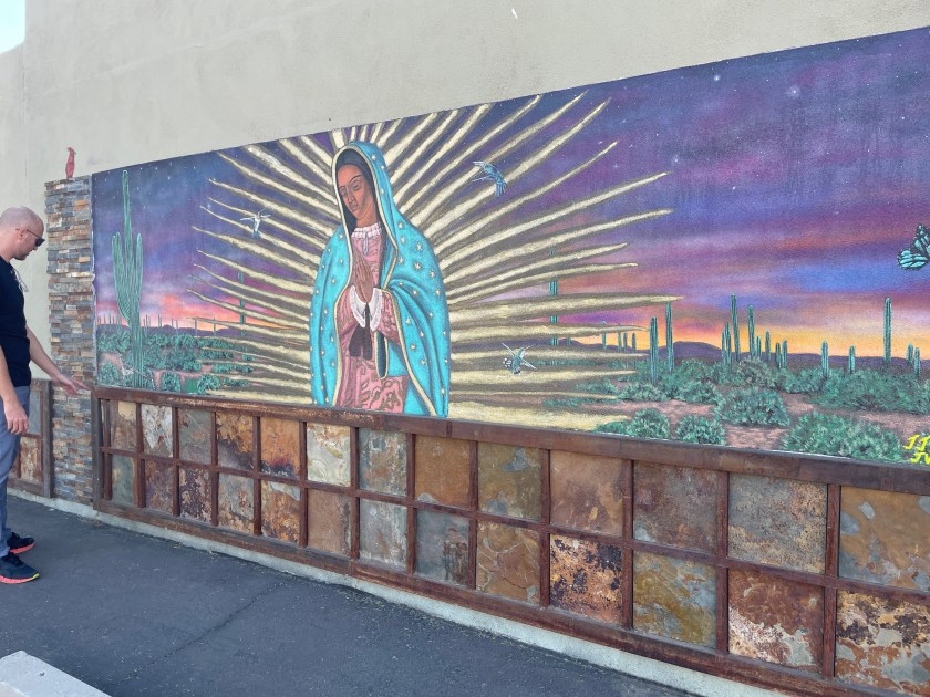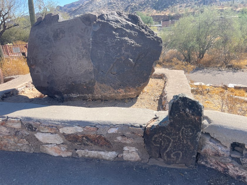 As Wallace and Cherland drove around Central to see ancient art, murals, and graffiti. Their first stop was at South Mountain Park, where they saw petroglyphs. Wiley talked about his knowledge of art history and how ancient artifacts like the petroglyphs and cave drawings are art. He stated that they are the earliest recorded forms of human expression. Some theories on petroglyphs and their meanings range from hunting scenes to ones about religion. The South Mountain Preserve has the most extensive collection of Native petroglyphs worldwide. Dr.Cherland shared that they come from the ancient Huhugam tribe and that some have been deciphered to tell Native origin stories of humanity.